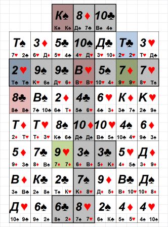 Вот такая вот короткая, длиною в тысячу с лишним лет, символическая поперечина «Православного Креста». И если сложить все порядковые номера карт, входящих в верхнюю перекладину, то мы получим еще одно доказательство многовекового «рабства в Матрице» славянских народов: К♠(52) + 8♦(34) + 10♣(23) = 109 => 109 – 52*2 = 5 => 5♥(5) Мы получили число 5, соответствующее в Матрице карте 5♥(5), на определенном уровне символизирующей «паразитическую жизнь», а точнее, многовековую эксплуатацию славянского народа чуждыми ему обеими ветвями Власти. ПОДНОЖИЕ "ПРАВОСЛАВНОГО КРЕСТА" - "ЖИЗНЬ В ДУХЕ" СЛАВЯНСКОГО НАРОДА - ЕГО САМАЯ ПРОЧНАЯ ОПОРА В ЭТОМ МИРЕ. Можно попытаться найти в Матрице и соответствие подножию «Православного Креста». Это подножие не случайно было «приделано» к Кресту, оно действительно стало служить опорой славянскому народу во всех его исторических «распятиях», когда представители обеих ветвей Власти добровольно - принудительно каждый раз вели его на очередную Голгофу. Исходя из этого, карты подножия «Православного Креста» будут иметь следующее символическое значение (слева - направо).