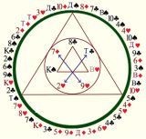 «Дух с Душой, живя в ладу, отведут всегда беду». Матричное сложение порядковых номеров всех 45 карт, образующих «кармический круг» дает нам карту Т♠(40), символизирующую либо успешное завершение очередного цикла программы, либо преждевременный выход из цикла - необходимость для Игрока преждевременно сдать свою «Фишку». 10. И все три геометрические фигуры Матрицы - треугольник «фиксированных карт», квадрат «полуфиксированных карт» и «кармический круг» - говорят о необходимости для Игрока доказать не только необходимость своей уникальной миссии по изменению Реальности Матрицы, то есть, доказать необходимость и целесообразность своего очередного воплощения, но и постараться выполнить эту миссию, несмотря на все трудности и препятствия, возникающие при прохождении очередного уровня программы. Матричное сложение порядковых номеров всех трех карт - 6♦ (32) + 6♥ (6) + Т♠ (40)=> К♣ (26) - дает нам карту К♣, символизирующую либо полную победу над неблагоприятными внешними обстоятельствами, победу над «целым миром мрака», миром СИП, и преобразование Реальности Матрицы в нужную сторону, либо «подчинение обстоятельствам», «тяжелое проклятье» и полную утрату Игроком «реализационной власти» над Реальностью Матрицы, погружение его в мир СИП (Системы Изъятия Потенциала). Обратившись вновь к «мудрости предков», вспомним, чему соотвествует 26-я карта Матрицы К♣. Это 26-я буквица старославянской Азбуки - «Ферт»: «встать Фертом – уверенно и гордо выразить свою Мудрость, Волю и Силу Духа». А если прочитать название буквицы в обратном порядке, то «Ферт», как раз, трансформируется в «Треф». Хотя, это всего лишь «совпадение»…