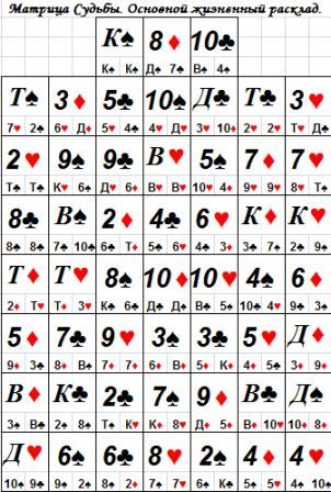 Карты бьются - играет судьба, И колоду меняет время. Люди любят игру в дурака, И растет молодое племя. М. Гуцериев «Джокер». Мы уже сказали о том, что все земное человечество живет в искусственно созданной для него Реальности – Реальности Матрицы, называемой еще Системой Изъятия Потенциала (СИП). А также о том, что Матрица – это определенного рода программа, которую можно изучать. И код этой программы был дан людям в виде последовательности игральных карт! Каждый, наверняка, хотя бы раз в своей жизни видел обычную колоду игральных карт, многие играли в карточные игры, кто-то даже пробовал раскладывать пасьянсы или просто гадать на картах. Но вряд ли кто-то всерьез задумывался над тем, что же такое карты? Миром управляют числа и символы. Символы, объединяясь, образуют системы – символические системы. Одной из таких символических систем является Матрица. О Матрице много написано в различных источниках. Наиболее популярными из них являются те, где знания Матрицы можно использовать в повседневной жизни, или, грубо говоря, в быту. Так, с помощью Матрицы можно определять астрологические характеристики конкретного человека (конечно не так точно, как с помощью Астрологии, однако вполне достаточно, чтобы составить психологический портрет), анализировать его взаимоотношения, подбирать подходящего партнера в жизни, и даже предсказывать будущее. Кроме того, с помощью Матрицы можно определять и те цели и задачи, к достижению которых стремится человек. Стандартная колода, состоящая из 52 карт, перетасованная и выложенная определенным образом, образует квадратную матрицу, размером 7 x7, с дополнительной верхней строкой, состоящей из оставшихся трех карт. Эта матрица называется Матрицей Судьбы. И это название не случайно. Матрица – это универсальная символическая система, символы которой – карты, позволяют описывать многие явления нашей жизни, в том числе личность и судьбу каждого человека. Всего существует 90 таких уникальных раскладов (от 0 до 89), которые не повторяются между собой. И каждый из раскладов соответствует определенному году жизни человека (от 0 до 89 лет). На основании каждого такого расклада можно определять программу развития человека на соответствующий год, то есть те цели и задачи, которые ему предстоит выполнить в течение года. Можно также предсказывать события, которые могут с человеком произойти, определять «подводные камни» и проблемы, с которыми ему придется столкнуться. Короче говоря, в Матрице заложена судьба человека или, иными словами, Матрица представляет собой программу развития человека от рождения и до момента перехода в мир иной. Поэтому она и называется Матрицей Судьбы. Но чаще ее называют во множественном числе Матрицей Судеб, так как людей много и у каждого своя Судьба. Развитие человека в Матрице происходит в соответствии с определенными циклами – его личная Реальность периодически меняется, ставя перед ним новые цели и задачи. И точно также периодически меняется и общая Реальность Матрицы, в которой мы все живем, - сегодня преобладают одни социально-экономические и политические условия, а завтра – другие. Смена Реальностей обычно сопровождается кризисами, преодолеваемыми эволюционным или революционным путем: «Карты бьются - играет судьба, и колоду меняет время». В МАТРИЦЕ ЗАЛОЖЕНА ПРОГРАММА РАЗВИТИЯ ЧЕ