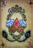 «Сердце будто проснулось пугливо, Пережитого стало мне жаль; Пусть же кони с распущенной гривой С бубенцами умчат меня вдаль. Звон бубенчиков трепетно может Воскресить позабытую тень, Мою русскую душу встревожить И встряхнуть мою русскую лень! Слышу звон бубенцов издалёка– Это тройки знакомый разбег, А вокруг расстелился широко Белым саваном искристый снег» Александр Кусиков. «Бубенцы». ГРАФИЧЕСКИЙ СИМВОЛ БУБНОВОЙ МАСТИ – СИМВОЛ КРИСТАЛЛИЧЕСКОЙ РЕШЕТКИ АЛМАЗА. Третья масть колоды игральных карт – Бубны. Считается, что графическое изображение символа масти Бубны заимствовано у французов, которые бубновый символ называют «Сarreaux» или Квадрат, как этот символ и изображается. Действительно, в немецком, французском, испанском и итальянском вариантах масть Бубен это Ромбы или Квадраты (Квадратики, Клетки). Но откуда мог взяться такой символ – Квадрат или Клетка? Ответ на этот вопрос можно найти в англоязычном названии бубновой масти – «The Diamonds» - что означает алмазы или бриллианты. Бриллианты это ограненные алмазы, но даже без внешней огранки и те и другие обладают своей структурой – кристаллической решеткой. Как известно из химии, элементарная ячейка структуры алмаза имеет форму куба. А гранями куба являются Квадраты. Кристаллическая решетка, да и любая решетка, ассоциируется, прежде всего, с ячейками решетки или Клетками. А каким образом масть Бубен связана с алмазами, мы поясним чуть ниже… БУБНЫ И БУБЕНЦЫ – ИНСТРУМЕНТЫ НАСТРОЙКИ СОЗНАНИЯ. В русскоязычном варианте название масти Бубны родственно наименованию музыкального инструмента - бубна, который в той или иной форме был известен многим народам древности. Бубен использовался не только как музыкальный инструмент для сопровождения песен и танцев, но и как магический инструмент в процессе общения с силами не проявленного (тонкого мира). Звук бубна создавал в пространстве определенные вибрации, позволявшие его обладателю настраиваться на резонирующие с ними вибрации тонкого мира и вступать во взаимодействие с этим миром. Считается, что Бубнами в России эта масть стала называться от немецкого слова . «Schellen», что означает бубенчики. Так, на старинных немецких картах, которые стали проникать в Россию через страны Восточной Европы в XVII веке, бубновая масть изображалась в виде звоночков, бубенчиков. В России в XVII - XVIII вв. эта масть так и называлась - звонки, боти. Однако, сам бубен, как музыкальный инструмент, был известен почти у всех славянских народов, задолго до официального появления игральных карт в Европе. Об этом говорит само слово «бубен», встречающееся в разных родственных языках, например, в украинском, сербском, чешском, польском. Это слово распространено почти у всех славянских народов и фонетически звучит тоже почти одинаково, что говорит о его древнем славяно – арийском происхождении. Скорее всего, этот инструмент и само слово «бубен» тоже досталось древним славянам - ариям как некий символ исчезнувшей северной цивилизации Гипербореи, а затем распространился по всему миру. На Руси всегда почитали звон бубенцов, который мог «душу встревожить», так как этот звон затрагивал самые глубокие, недоступные в обычном состоянии сознания слои Души, а именно: ее буддхиальный уровень, уровень жизненных ценностей, долгосрочных жизненных программ развития, связанных с ду